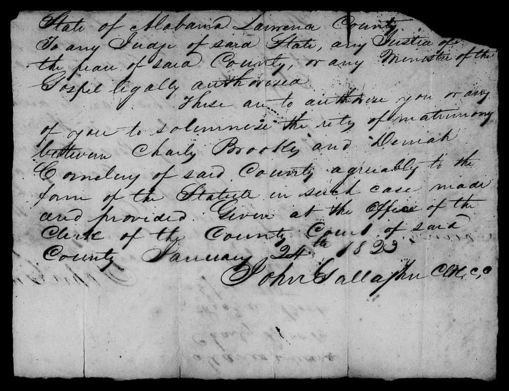 [7] Lawrence County, Alabama, Marriage Bk. 1, p. 20; and see the marriage license and return by D.W. Wright in Lawrence County, Alabama, Marriage Bond and Licenses 1819, available digitally at FamilySearch.
