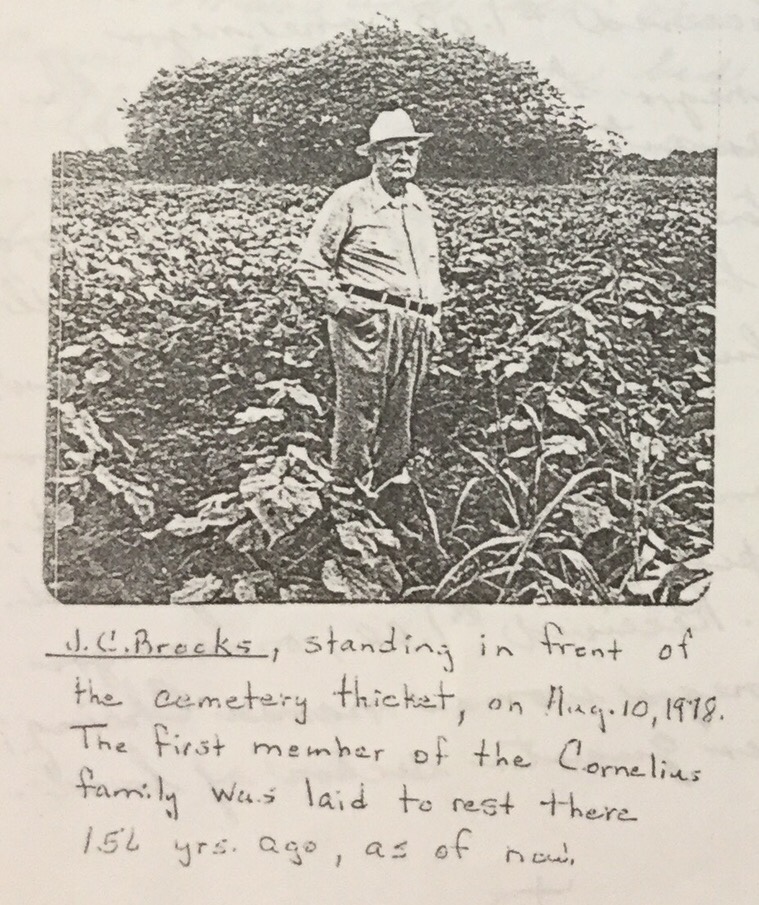 By his first wife Susan Buchanan, John Cornelius Brooks had the following children (all surname Brooks): Charles Simeon (1854-1937; married 1] Martha E. Wood and 2] Patience Mulviney Harris); Deniah Martha Jane (1856-1939; married Bolin White Hendrick); Margaret Ann Elizabeth (1858-1895; married Jeptha P. Estes); Almira Emaline (1860-1942; married William L. Young); Sarah Malinda (1862-1951; married John Watson Roper); Frances Lucinda (1864-1890; married James Allen Bruner); William Anderson (1866-1890; married Ollie O. Bruner); Euna Marcus (1868-1957; married James Allen Bruner); Leonora (1870-1959; married William Van Lesley); Ira Cornelius (1872-1941; married Mina V. Jeter); Wesley Phillip (1874-1928; married Jennie Pearl Owens); John Watson (1876-1928; married Mary Elizabeth Orman); and Mary Edith Sula (1878-1965; married Marion Cullen Taylor).