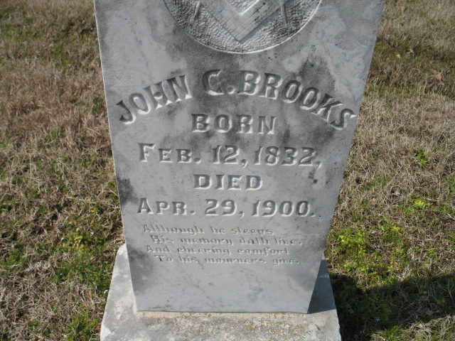 Being attracted by adventure and favorable reports of farming opportunities, John C. Brooks left Mississippi in 1894 and went to Texas. He first settled in Wood County, later moving to Navarro County, and finally living in Van Zandt County. Six years after going to Texas, he died at the home of one of his younger sons, John Watson Brooks, near Mabank, Texas, on April 29, 1900. His burial place is in the Elm Grove Cemetery, Van Zandt County, Texas. The grave of John Cornelius Brooks is marked by a marble gravemarker erected by his heirs from the balance of his estate. The marble gravemarker for Susan Buchanan Brooks who is buried in the Shiloh Cemetery in Mississippi was erected after her death by her daughter, Sarah Malinda (Sal) Brooks Roper.