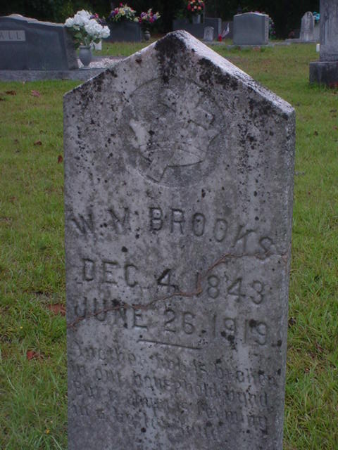 William Mack Brooks was born 4 December 1843 in Lawrence County, Alabama, and died 26 June 1919 at Eggville in Lee County, Mississippi. He’s buried with wife Martha in the Eggville cemetery with a tombstone stating his dates of birth and death.[24]