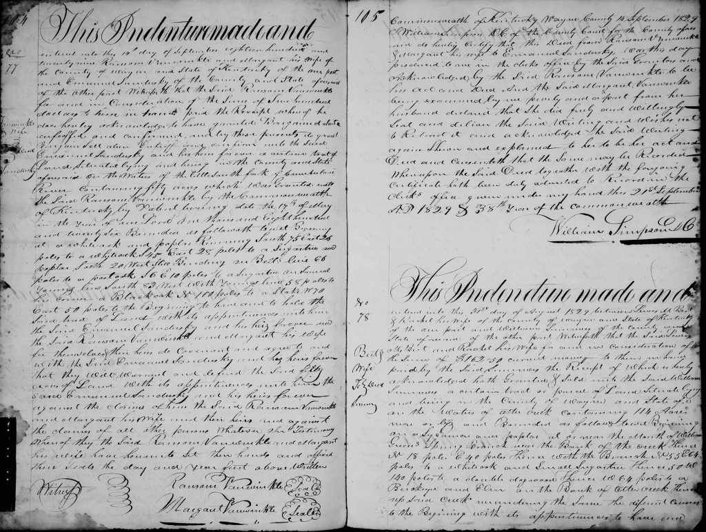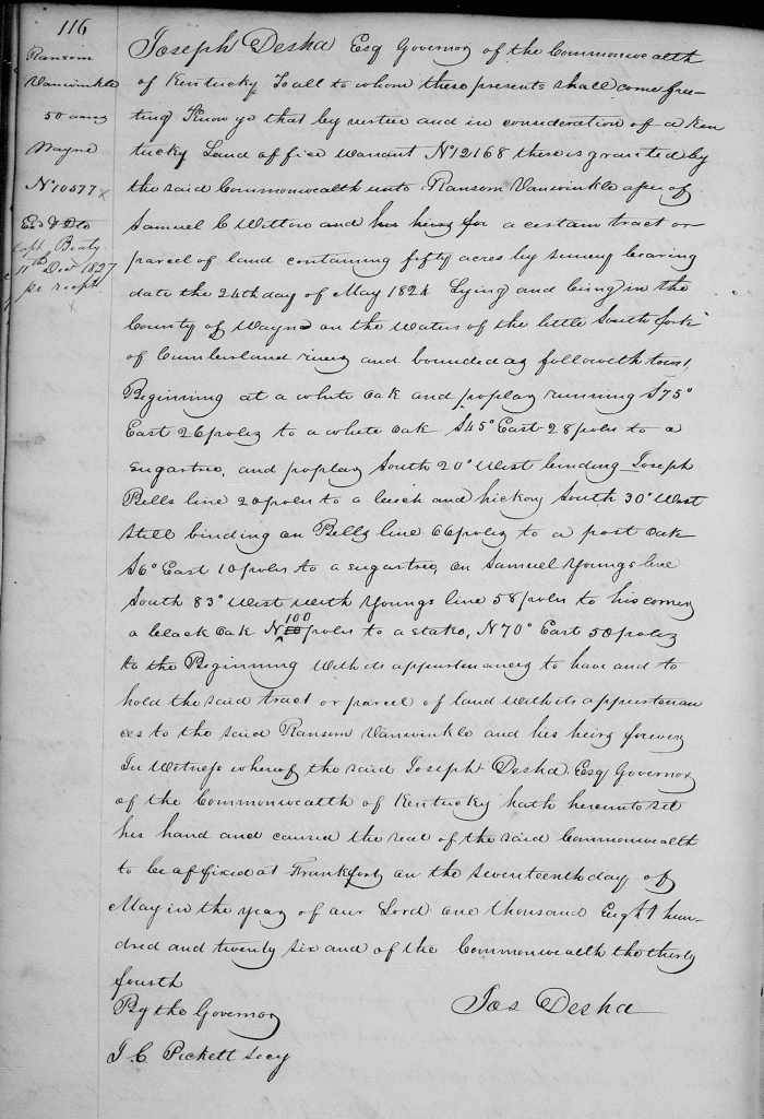 Following their marriage in September 1823, Ransom and Margaret lived in Wayne County until the fall of 1829, when they moved to Illinois. On 17 May 1826 Ransom received a grant from the state of Kentucky for 50 acres of land in Wayne on the south fork of the Cumberland River.[11] The grant document states that the land was granted under warrant 12168, which had been assigned to Ransom by Samuel C. Witten and his heirs. The land was surveyed 24 May 1825. Ransom and wife Margaret would sell this piece of land in September 1829 as they prepared to move to Illinois.