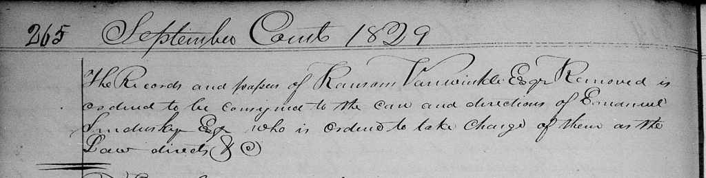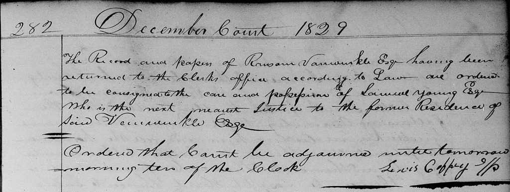At December court 1829, court minutes state that the records and papers of Ransom Vanwinkle Esq. had been returned to the clerk’s office and consigned to the care and possession of Samuel Young Esq., the justice living nearest to the former residence of the said Vanwinkle.[15] Having taken possession of the official papers of Ransom Van Winkle that had been left behind at his residence, which Sandusky had purchased, Sandusky then delivered them to Samuel Young. Finally, at May court 1832, court minutes state that the records and papers of Ransom Vanwinkle Esq. had been ordered to be committed to the care and charge of Joshua Oath (Oates) Esq.[16]