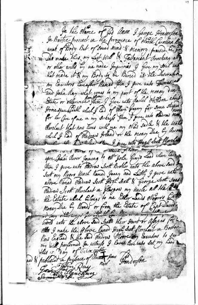 After witnessing Thomas Jones’s sale of Eden House plantation to George Phenney in December 1736, George Strachan witnessed the will of George Henderson in Bertie Precinct on 15 October 1736, which mentions Henderson’s uncle Andrew Scott, a merchant in Glasgow, and Andrew’s sons Hugh, a Boston merchant, as well as Hugh’s brothers George and Andrew.[11] George Henderson left Hugh Scott 1,800 acres on the Cashie River that he had purchased from Cullen Pollock, land on which it seems George was living at the time of his death.