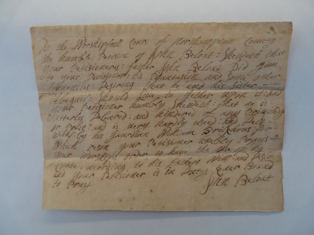 A 13 November 1725 petition made by Elishea’s oldest brother John Belote (Beloat in this document) to Northampton County court states that at that time, he and Elishea’s oldest sister Abigail were under the guardianship of William Brickhouse, and that Brickhouse was keeping them from enjoying the use of the estate willed to them by their father.[21] M.K. Miles names these two Johns as John Belote III and John Belote IV. As the May 1722 will of John Belote III transcribed above states, John III wanted John IV and his sister Abigail (while she was unmarried) to live on the home plantation in Northampton County which John III willed to John IV. The will does not place John IV and Abigail under anyone’s guardianship though it does stipulate that Elishea was to be under William Brickhouse’s guardianship until she was aged sixteen.