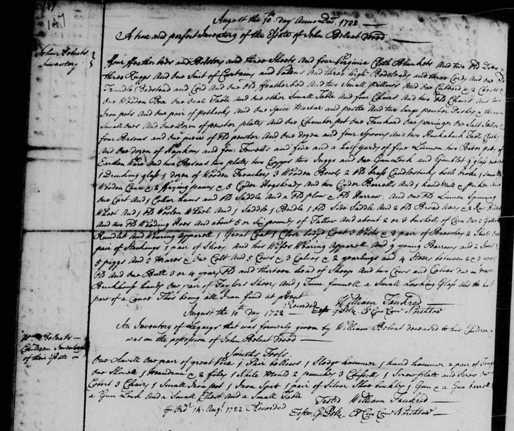 The inventory of John’s estate was made by William Tankred on 14 August 1722. In November 1722, Tankred, along with John Major and George Harmanson, divided John Belote’s estate according to the stipulations of his will.[19] The estate division does, of course, name John’s heirs, and includes Elishe Belioat. Here’s my transcription of the estate division, which includes some words I cannot make out: