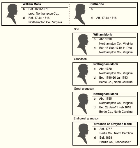 In a series of postings I began in May 2018, I tracked the ancestry of Strachan Monk (1787-1850/1860) of Bertie and Martin Counties, North Carolina, and Hardin County, Tennessee. As the initial posting in this series tells you, Strachan Monk, whose given name is often spelled phonetically (i.e., conforming to its pronunciation) as Strahon, Strayhon, or even Strawhorn, was the son of Nottingham Monk and Rachel Strachan of Bertie County, North Carolina.