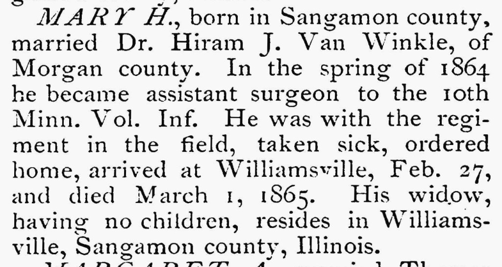 MARY H. [VanMeter], born in Sangamon county, married Dr. Hiram J. Van Winkle, of Morgan county. In the spring of 1864 he became assistant surgeon to the 10th Minn. Vol. Inf. He was with the regiment in the field, taken sick, ordered home, arrived at Williamsville, Feb. 27, and died March 1, 1865. His widow, having no children, resides in Williamsville, Sangamon county, Illinois.