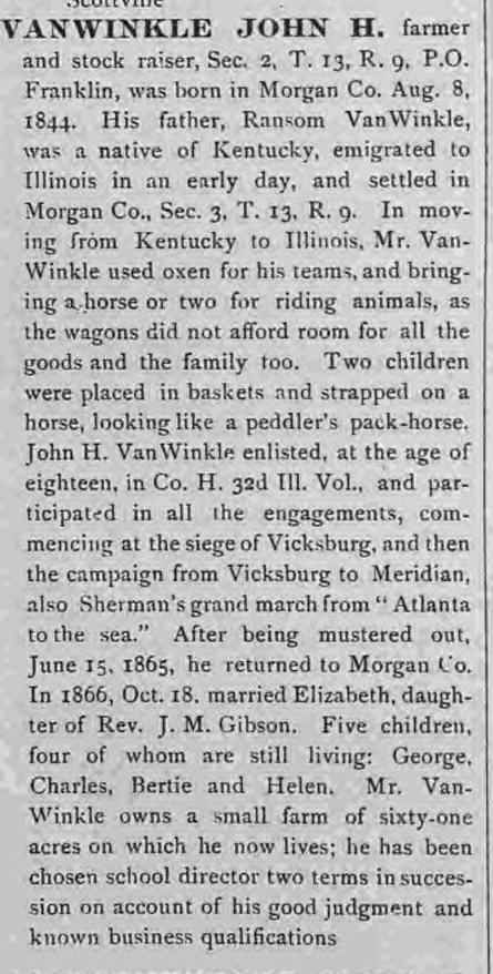 VanWinkle, John H. farmer and stock raiser, Sec. 2, T. 13, R. 9, P.O. Franklin, was born in Morgan Co. Aug. 8, 1844. His father, Ransom VanWinkle, was a native of Kentucky, emigrated to Illinois in an early day, and settled in Morgan Co., Sec. 3, T. 13, R. 9. In moving from Kentucky to Illinois, Mr. VanWinkle used oxen for his teams, and bringing a horse or two for riding animals, as the wagons did not afford room for all the goods and the family too. Two children were placed in baskets and strapped on a horse, looking like a peddler’s pack-horse. John H. VanWinkle enlisted, at the age of eighteen, in Co. H. 32d Ill. Vol., and participated in all the engagements, commencing at the siege of Vicksburg, and then the campaign from Vicksburg to Meridian, also Sherman’s grand march from “Atlanta to the sea”. After being mustered out, June 15, 1865, he returned to Morgan Co. In 1866, Oct. 18, married Elizabeth, daughter of Rev. J. M. Gibson. Five children, four of whom are still living: George, Charles, Bertie and Helen. Mr. VanWinkle owns a small farm of sixty-one acres on which he now lives; he has been chosen school director two terms in succession on account of his good judgment and known business qualifications.