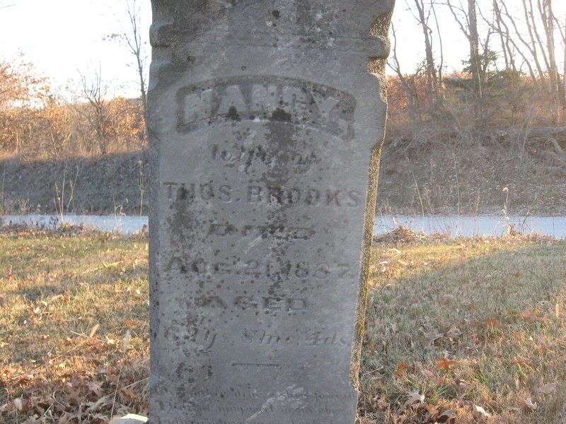 Thomas Whitlock Brooks is thought to be buried in Vince cemetery just northeast of Moberly in Randolph County, though, as his Find a Grave memorial page for this cemetery states, there is no marker for a grave for him in the cemetery.[44] The memorial page states that is burial in the cemetery is recorded in an “old listing.” His wife Nancy Westfall Brooks is buried at Vince with a marker stating that she was the wife of Thos. Brooks and died 21 August 1887, aged 63 years, 8 months, and 4 days.[45] This would give Nancy a birthdate of 17 December 1823. As has been noted, Nancy’s parents Cornelius and Edith Wilson Westfall are also thought to be buried at Vince, and other members of the Westfall family are buried there, as are Thomas and Nancy’s children John T., Virginia/Jennie, and Emily.