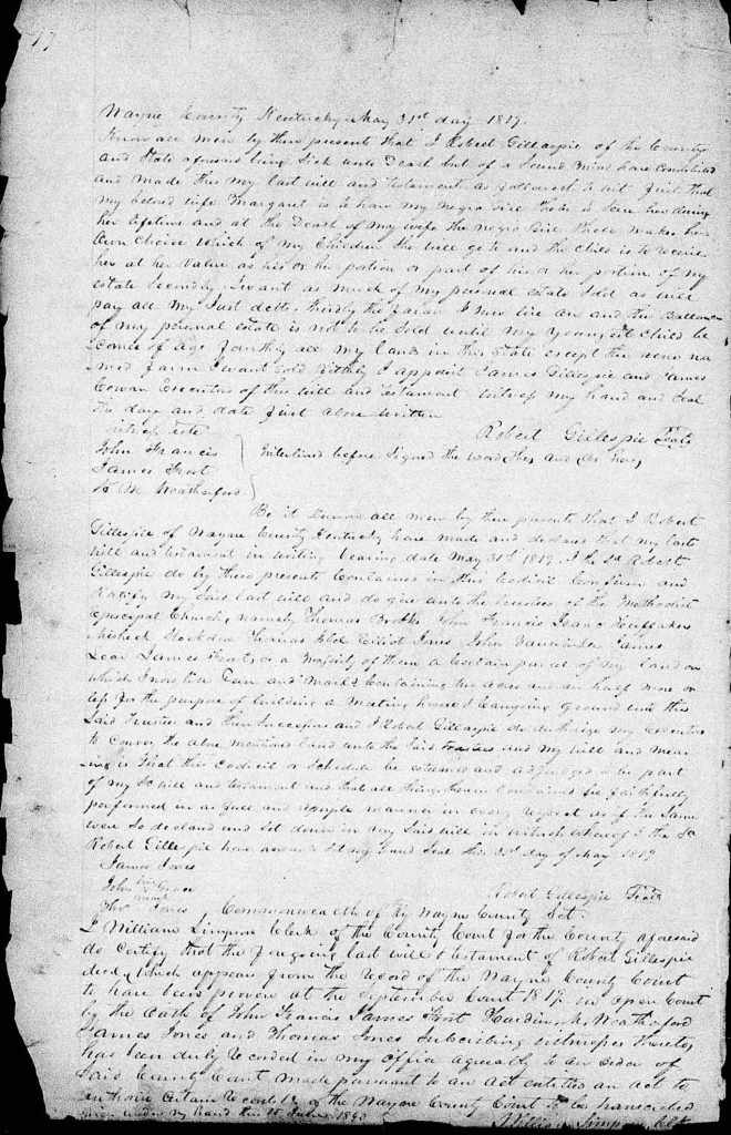 Nancy Gillespie’s father Robert Gillespie made a will in Wayne County on 31 May 1819.[6] The will names wife Margaret and son James and speaks of other children without naming them, noting that Robert’s youngest child was not yet of age. The will made Robert’s son James Gillespie and Andrew Cowan executors.