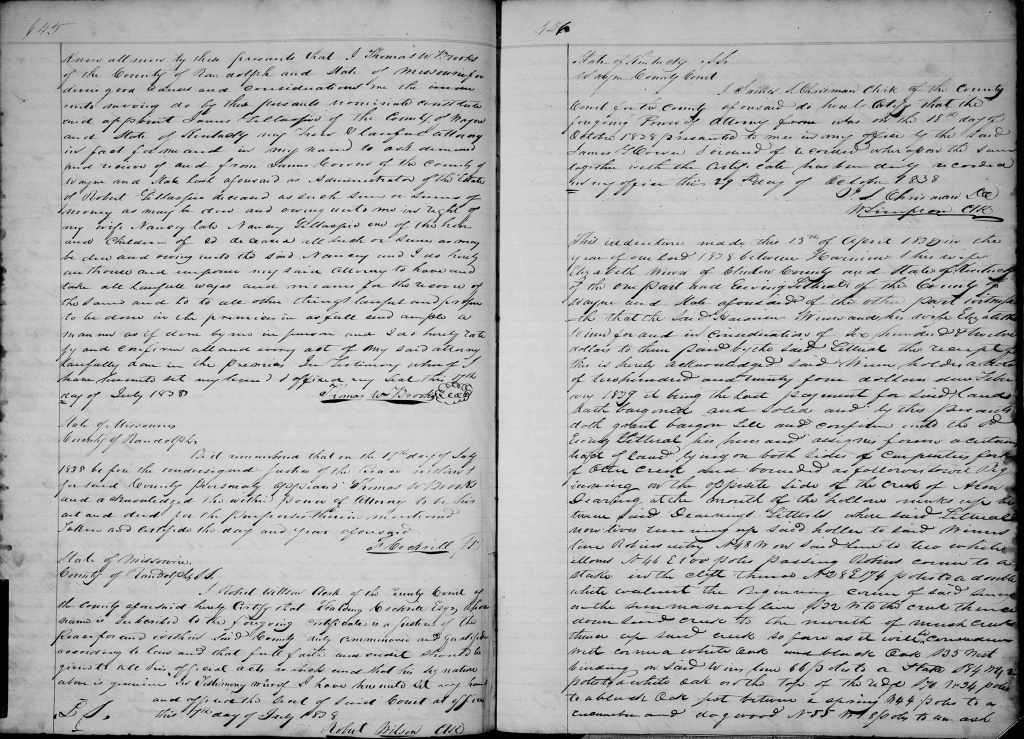 On 17 July 1838, Thomas W. Brooks of Randolph County, Missouri, appointed James Gillespie his attorney in Wayne County, Kentucky, to receive from James Carver Thomas’s share of the estate of his deceased father-in-law Robert Gillespie.[25] The power of attorney states that Thomas W. Brooks’s wife Nancy was a child and heir of Robert Gillespie. Thomas signed the power of attorney as Thomas W. Brooks, and with the document recorded in Wayne County is an attestation by Robert Wilson of Randolph County, Missouri, that Thomas W. Brooks had proved it in Randolph County. James Cowan presented the document in Wayne County on 18 October 1838 and it was recorded on 29 October.