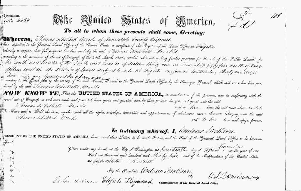 Thomas began acquiring land in Randolph County immediately upon his relocation there. On 19 October 1832, he claimed federal land at the Fayette land office, receiving a certificate for 31.61 acres on 30 September 1835.[19] The certificate names Thomas as Thomas Whitlock Brooks of Randolph County, Missouri, and states that the tract was the southwest ¼ southwest ¼ of section 31, township 55 north, range 15 west.