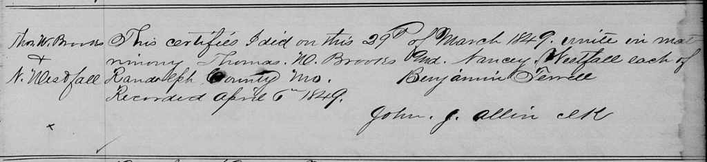 On 29 March 1849, Thomas W. Brooks married Nancy Westfall in Randolph County.[33] Nancy was the daughter of Cornelius Westfall (1790-1874) and Edith Wilson, who moved to Randolph County in 1838 from Lewis County, Virginia (now West Virginia), and who are thought to be buried in Vince cemetery, though no tombstones are extant to verify this.[34] A biography of their son William H. Westfall in History of Randolph and Macon Counties, Missouri, states that Cornelius and Edith Westfall “were highly respected residents of Randolph county and the father was a man of sterling worth and great industry. He was one of the most energetic farmers of his vicinity and he and his wife were faithful church members.”[35]