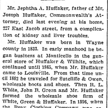Or, Subtitled: “He began business at Monticello in the general store of Huffaker & Wilhite” This posting is a continuation of the previous one, which discussed Hannah Brooks, daughter of Thomas Brooks (1775-1838) and Sarah Whitlock. As the previous posting indicates, Hannah married Wesley Huffaker, son of Isaac Huffaker and Elizabeth Hutchinson, in Wayne County, … More Children of Hannah Brooks (1811-1853) and Husband Wesley Huffaker of Wayne County, Kentucky