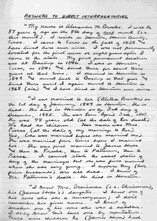 The deposition of Alexander M. Brooks and other documents from the Harriman vs. Giddings case appear in a manuscripts and documents gathered in a collection by George W. Glass entitled “Hope Family Notes [and] Notes on Aletha Sorrels Hope.” The collection consists of handwritten and typewritten notes of Glass about the Brazos County case, and notes about the family history of Aletha Sorrells, including her five marriages. The manuscript also sketches the history of the Hope family. George William Glass (1924-1976), a genealogist in Houston, was a great-grandson of Mary Jane Moffatt Harriman, one of the plaintiffs in Harriman vs. Giddings. The original typescript and collection of documents that comprise “Hope Family Notes [and] Notes on Aletha Sorrels Hope” are held by Clayton Library Center for Genealogical Research in Houston. The collection has been filmed and digitized by the Family History Library of Salt Lake City and is available digitally through the FamilySearch site.