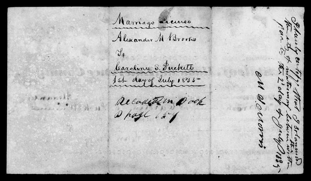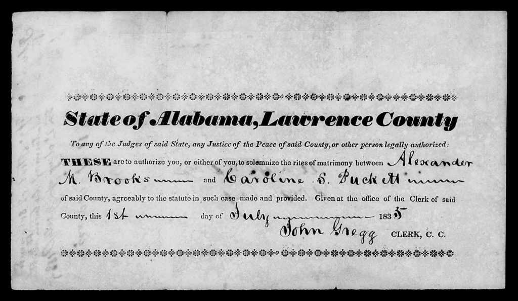 On 2 July 1835 in Lawrence County, Alexander M. Brooks married Caroline Puckett.[8] The marriage file shows Alexander receiving license for the marriage on 1 July and Rev. Moses Stroude Morris marrying the couple the following day. There is no bond in the file. On Moses Stroude Morris, a Methodist minister who officiated at the marriages of Alexander’s nephews and nieces John Wesley Lindsey, Mark Jefferson Lindsey, Sarah Brooks Lindsey, and Mary Jane Lindsey, see this previous posting.