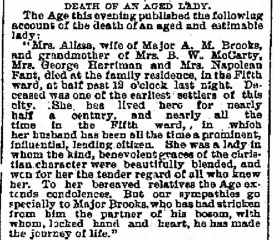 Mrs. Aletha, wife of Major A.M. Brooks and grandmother of Mrs. B.W. McCarty, Mrs. George Harriman, and Mrs. Napolean Fant, died at the family residence in the Fifth ward at half past 12 o’clock last night. Deceased was one of the earliest settlers of this city. She has lived her for nearly half a century, and nearly all the time in the Fifth ward, in which her husband has been all the time a prominent, influential, leading citizen. She was a lady in whom the kind, benevolent graces of the christian character were beautifully blended, and won for her the tender regard of all who knew her. To her bereaved relations the Age extends condolences. But our sympathies go especially to Major Brooks, who has had stricken from him the partner of his bosom, with whom, locked hand and hand, he has made the journey of life.