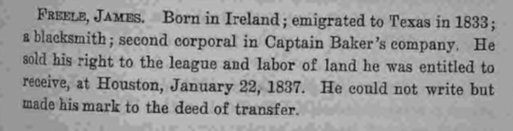 A brief biography of James Freel(s) is found in Sam Houston Dixon and Louis Wiltz Kemp’s The Heroes of San Jacinto.[8] This states that he was born in Ireland and came to Texas in 1833, where he was a blacksmith and served as 2nd corporal in Capt. Baker’s company, being entitled to receive land at Houston, which he sold on 22 January 1837.