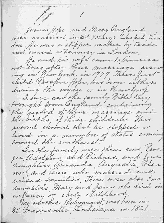 Glass’s “Hope Family Notes [and] Notes on Aletha Sorrels Hope” state that on 25 October 1968, he had received a copy of the record of Aletha Sorrells’s marriage to James Hope on 10 March 1824 in Natchitoches Parish, Louisiana. Glass’s notes say that at the time of her marriage to James Hope, Aletha was perhaps working as a seamstress for James, who may have been, according to some family stories, a tailor in St. Francisville, Louisiana, and who had been prior to his emigration to America a slipper maker in London. Glass’s notes reproduce a manuscript written about 1920 by James’s granddaughter Ann A. Shapard, a daughter of Thomas J. Shapard and Ann Hope, which says that James Hope and Mary England were married in St. Mary’s Chapel, London, and that he was a slipper maker at the time and owned a tannery in London.