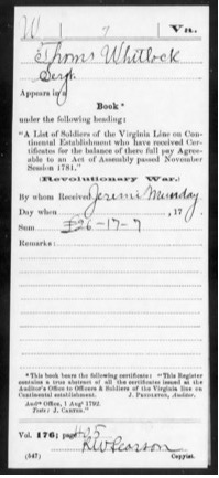 Thomas Whitlock continues on muster rolls of the company from January 1778 until his discharge on 1 May 1778. An undated entry states that Thomas Whitlock received a certificate for the balance of his pay in accord with the act of assembly dated November 1781; the certificate was in the amount of £16 17s and 7d, and was received (apparently on behalf of Thomas Whitlock) by Jeremi Munday. This card in the service packet states that this payment is recorded in Bk. 176, p. 405. I haven’t been able to identify this record. Does the notation refer to the Commissioner’s Books of the Virginia Auditor of Public Accounts? If so, I haven’t noted a book 176.