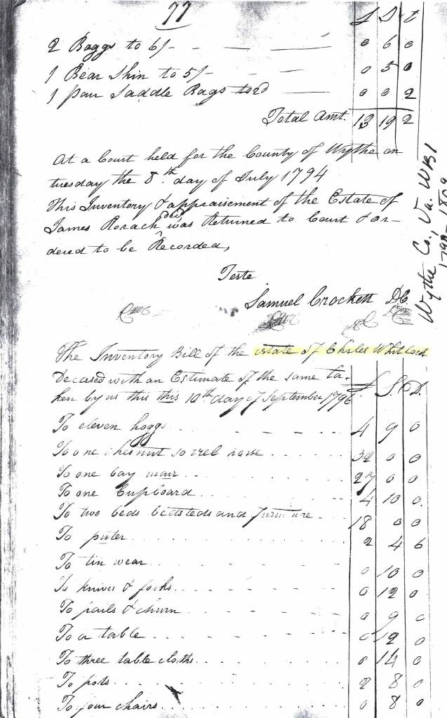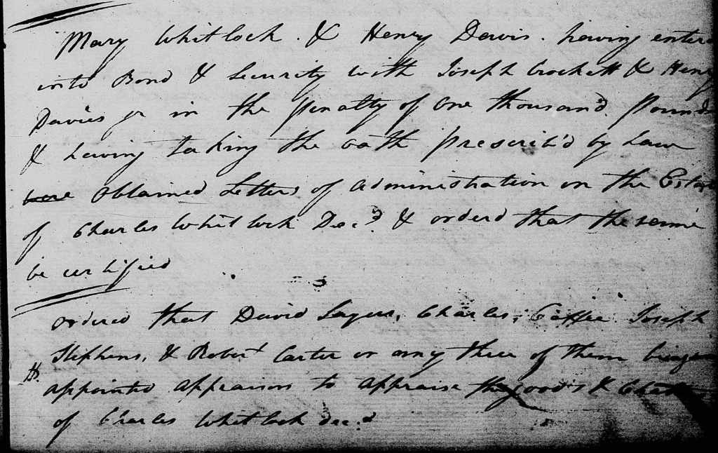 The preceding affidavits from the Whitlock vs. Whitlock case file cast interesting light on the life of Charles Whitlock and his wife Mary Davies from not long before they and up to Charles’s death in April 1796 and in the period after his death, when Mary remained on the land on which they had been living next to Charles’s father Thomas Whitlock. After Charles died in April 1796, Mary and her father Henry Davies gave bond on 9 August 1796 with Joseph Crockett and Henry Davies Jr. in the sum of £1,000 to administer Charles’s estate.[7] Wythe court then ordered David Sayers, Charles Coffee/Calfee, Joseph Stephens, and Robert Carter to appraise the estate.