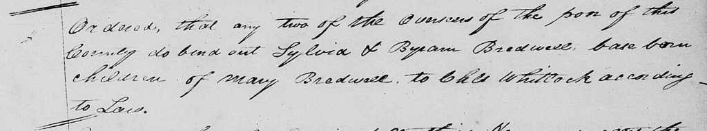 Wythe court minutes for 11 June 1799 state that Sylvia and Byram Bredwell, base-born children of Mary Bredwell, were bound out on that date to Charles Whitlock.[10] Since it’s clear that Charles Whitlock, son of Thomas and Hannah Phillips Whitlock, had died in April 1796, I’m not quite sure what to make of this record. Does it mean that the Bredwell siblings were bound to the estate of Charles Whitlock? Or does this record refer to the Charles Whitlock for whom Thomas Whitlock’s son Charles was named, Thomas’s brother Charles, who, as far as I know, did not ever live in Wythe County, Virginia, but who was still living in June 1799 in Stokes County, North Carolina?