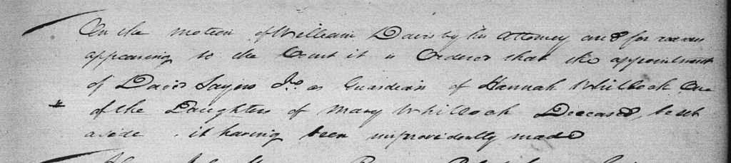 Wythe court minutes for 9 March 1808 state that, on the motion of William Davies, the appointment of David Sayers Jr. as guardian of Hannah Whitlock had been set aside, since it had been “improvidently made.”[18]As a previous posting notes, down the road, when Thomas Whitlock made his will in Cumberland County, Kentucky, on 22 January 1824, he stated, “I give and bequeath to my 2 grand Daughters the heirs of my Son Charles Whitlock Deceased Two dollars in full of their part of my estate.”[19]