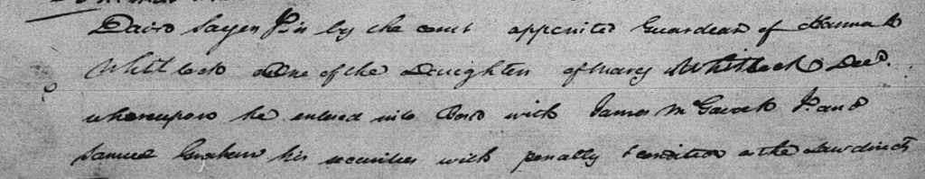On 8 May 1798, Wythe court appointed a guardian for Charles’s two daughters Agnes/Nancy and Hannah Whitlock. The guardian appointed was their mother’s uncle William Davies, who posted a bond of $1,000 for the guardianship with their grandfather Henry Davies and Robert Sayers.[9]