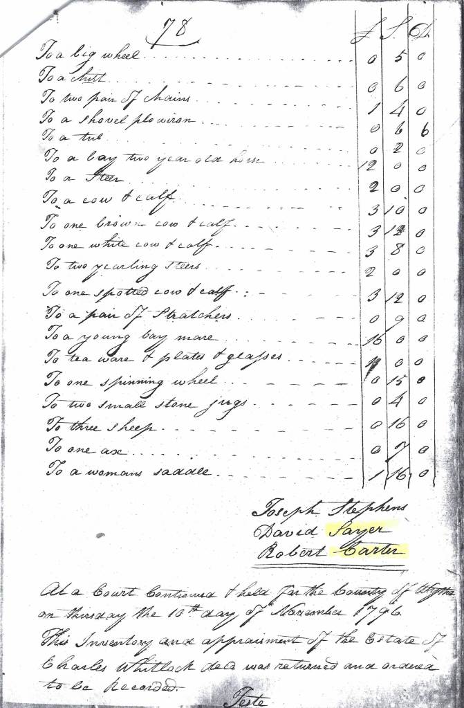 On 10 September 1796, the inventory and appraisal were done by Joseph Stephens, David Sayers, and Robert Carter. The estate consists of various farm implements, livestock (eleven hogs, five horses, cattle, and sheep), and household items such as a cupboard, two beds, pewter, tinware, a table, four chairs, a spinning wheel, a chest, tea ware, plates, and glasses. Stephens, Sayers, and Carter presented the inventory to court on 10 November 1796 and it was then recorded.[8]