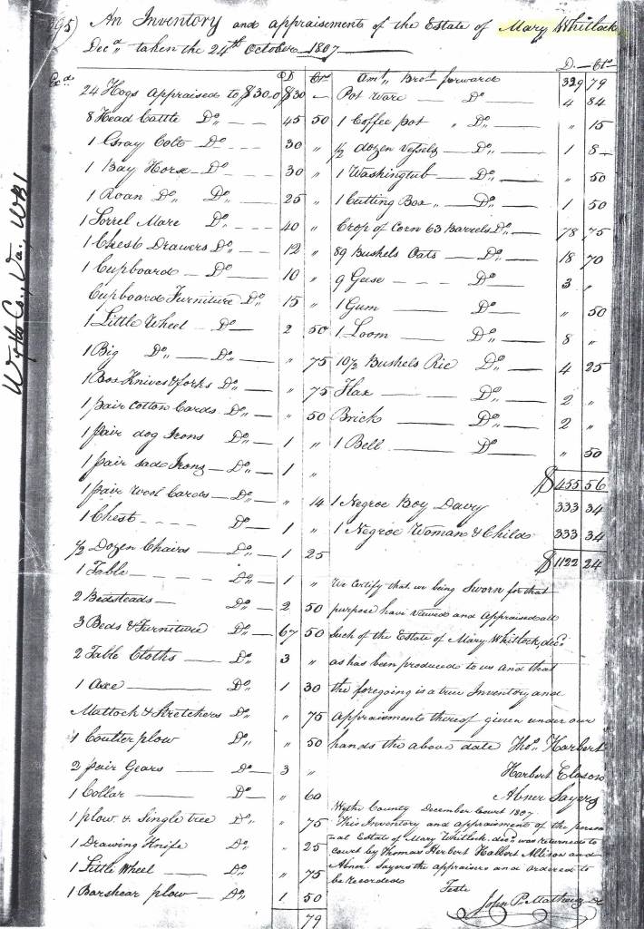 On 24 October 1807, Thomas Herbert, Harbert Allison, and Abner Sayers inventoried the estate of Mary Davies Whitlock.[15] The estate consisted of livestock (hogs, cattle, horses, geese), various household items and farm tools, an enslaved boy Davy, and an unnamed enslaved woman and her child. It was valued at $1,122.24. The inventory was recorded at Wythe court on 8 December 1807.[16]