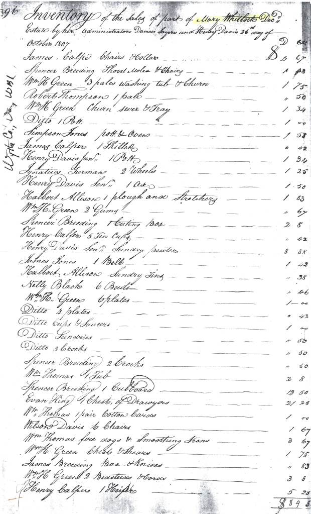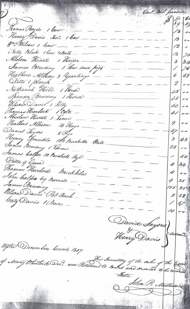 Mary’s estate was sold by David Sayers and Henry Davies on 26 October 1807.[17] Though the inventory had included three enslaved persons, they do not appear in the estate sale. The chief buyers at the sale were members of Mary’s family, including her father Henry and brother Henry, Jr., along with Wilson Davies and Caty Davies. Members of interrelated families, including Spencer Breeding and Absalom Hurst, were also buyers at the sale. The sale was returned to court in December 1807.