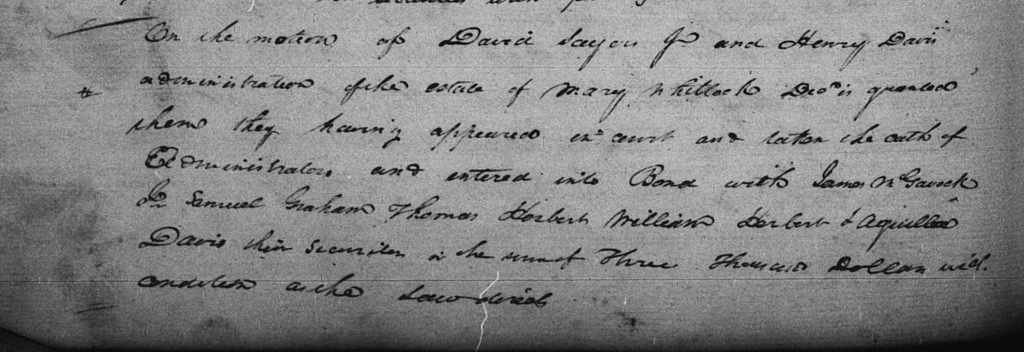By 13 October 1807, Mary Davies Whitlock had died in Wythe County. On that date, David Sayers Jr. and Henry Davies gave bond in the amount of $3,000 with James McGavock Jr., Samuel Graham, Thomas Herbert, William Herbert, and Aquilla Davis for administration of Mary’s estate.[12] Henry Davies was, of course, Mary’s father. David Sayers Jr. was Mary’s brother-in-law, husband of her sister Rhoda.