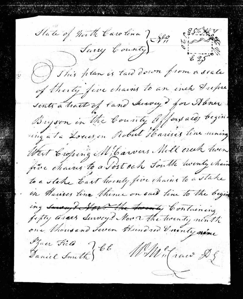 Abner Bryson entered 50 acres of land in Surry County on 11 February 1796, an indication, it seems to me, that he may either have married by this date or was planning to do so.[9] The tract was on Robert Harris’s line with McCarver’s mill creek running through its middle. The land was surveyed 29 November 1799 by W. McCraw with chain carriers Isaiah (Izaer in the original) Field and Daniel Smith. The survey was recorded 9 January 1800 and the grant issued 30 August 1802.