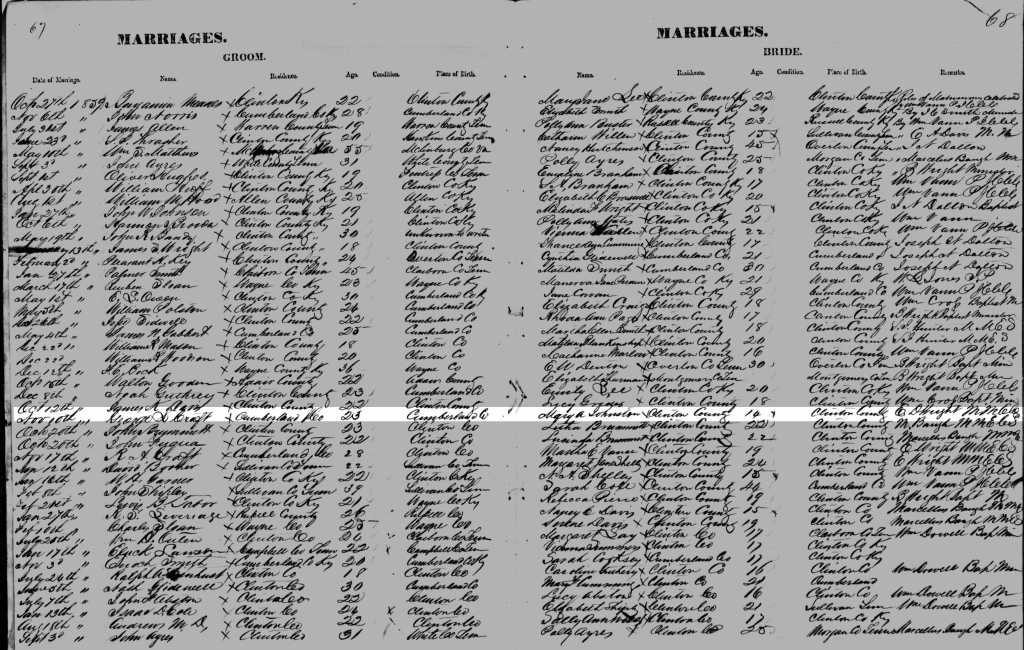 [19] Clinton County, Kentucky, Marriage Register 1859, pp. 67-8.