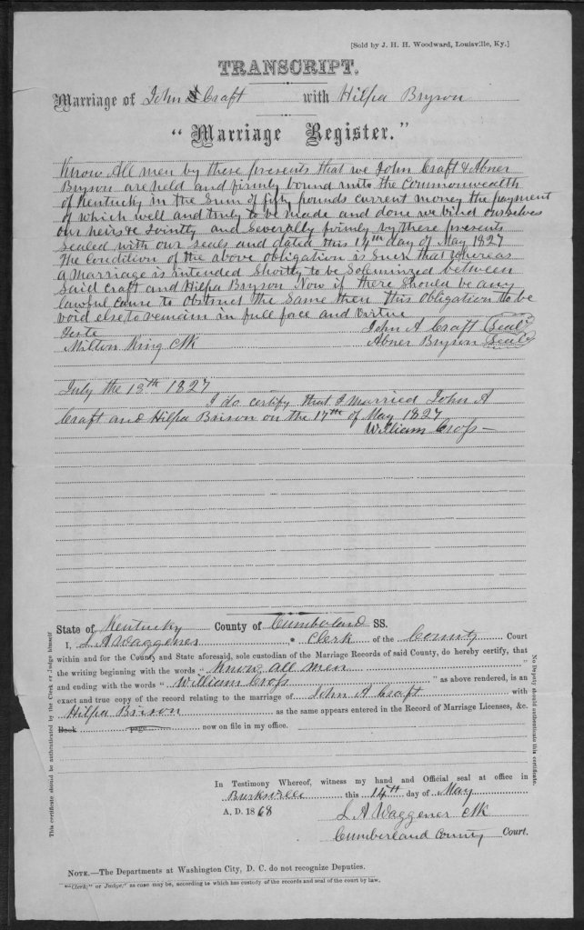 On 17 May 1827 in Cumberland County, Hilpa Bryson married John Anderson Craft, son of Michael Craft and Elizabeth Christian of Cumberland County. A transcript of the record of the marriage of John A. Craft and Hilpa Bryson is in the file of a pension for which John applied when their son Gilbert Bryson Craft died as a Union soldier at the hospital in Knoxville, Tennessee, on 4 December 1863 (see below).[3] The marriage record shows John A. Craft giving bond with Hilpa’s father Abner Bryson on 14 May 1827, and then William Cross filing the marriage return on 13 July 1827, stating that he married the couple on 17 May.