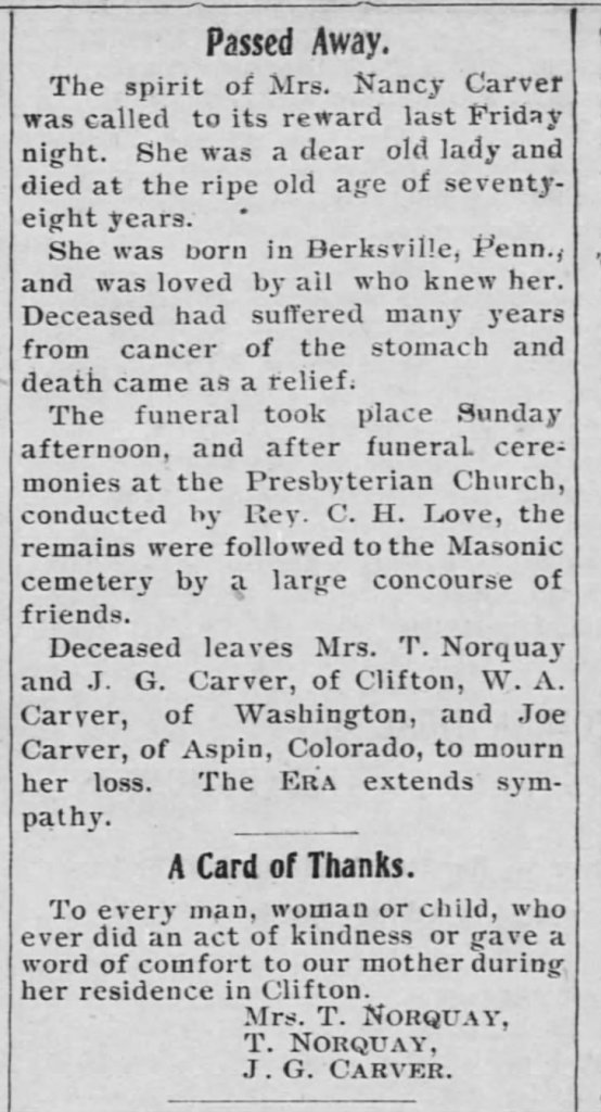 [14] “Passed Away,” Copper Era and Morenci Leader (Clifton, Arizona) (21 March 1907), p. 3, col. 5.