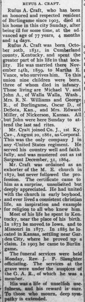 [18] “Rufus A. Craft,” Osage County Chronicle (Burlingame, Kansas) (18 March 1909), p. 1, col. 1.
