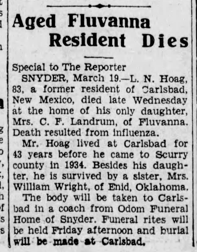 [16] See “Aged Fluvanna Resident Dies,” Abilene Daily Reporter (19 March 1936, p. 14, col. 6; “Rites Here for Pecos Pioneer,” Carlsbad [New Mexico] Current-Argus (19 March 1936), p. 1 col. 6; and “L.N. Hoag Burial to Be in Carlsbad, N.M.,” Fort Worth Star-Telegram (20 March 1936), p. 4, col. 4.
