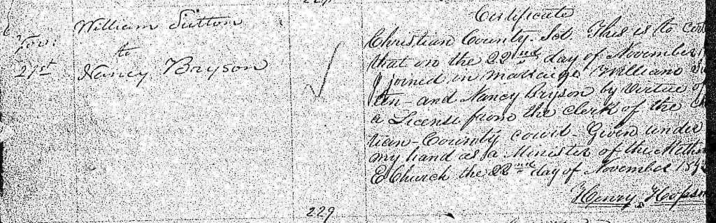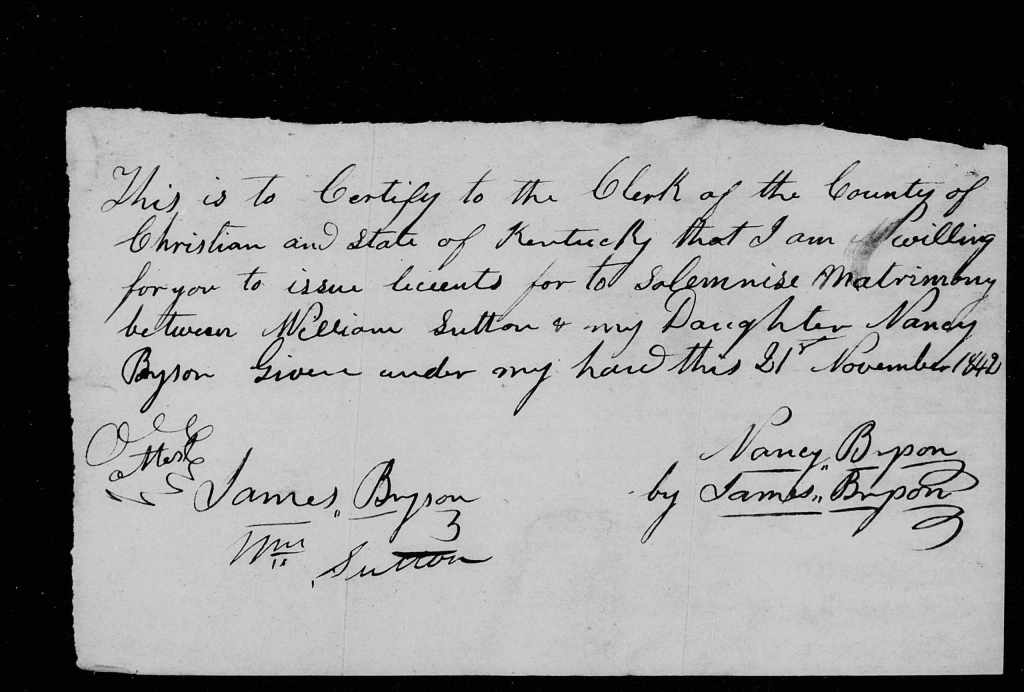 On 22 November 1842 in Christian County, Nancy married William Bryan Sutton, son of William Sutton.[2] Nancy’s brother James Bryson gave bond for the marriage with William B. Sutton on 21 November 1842. On the same day, James Bryson submitted a signed statement that he was the “parent” of Nancy and son of Nancy Bryson Sr., who was unable to subscribe, so that he was signing in their mother’s place. (Abner Bryson, Nancy and James’s father, had died in 1839). William B. Sutton signed at the same time vouching that he was 21. A note signed by James Bryson the same day and preserved in the marriage file states that Nancy’s mother Nancy Whitlock Bryson agreed to the marriage. This note has both James Bryson’s and William B. Sutton’s signatures.