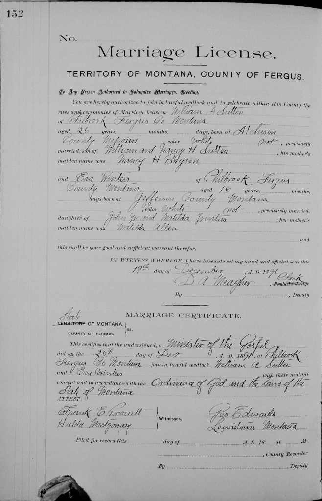 [29] Fergus County, Montana Marriage Bk. 1, p. 152.