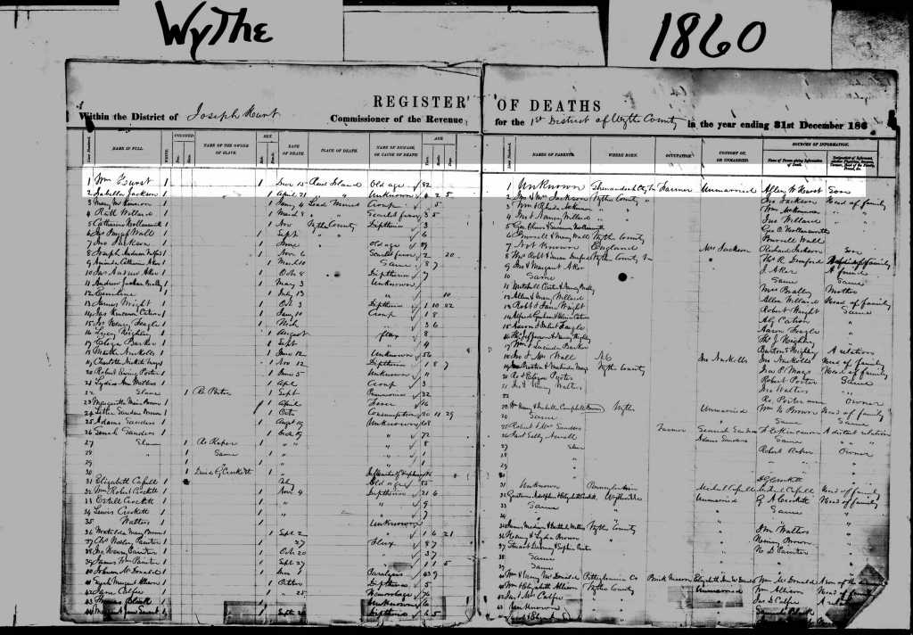 [5] Wythe County, Virginia, Death Register 1860, unpaginated, digitized at FamilySearch.