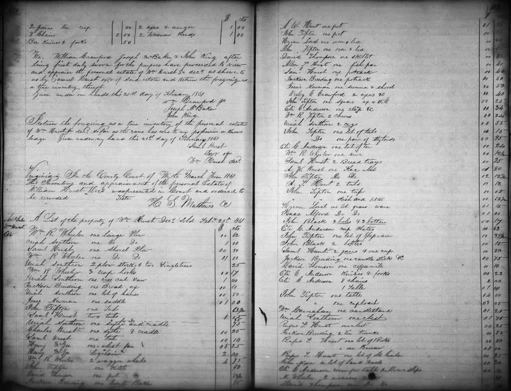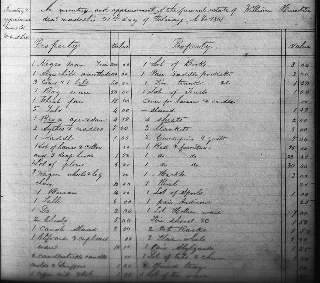 William Hurst’s estate in Wythe County was inventoried on 21 February 1861, with a sale held on the 25th.[47] William Crawford, Joseph M. Baker, and John King inventoried and appraised the estate with Samuel Hurst confirming the inventory and appraisal, which was recorded in March 1861. Buyers at the estate sale included William and Mildred’s son Allen and sons-in-law Samuel Hurst, William Carnahan, Uriah and William C. Suthern. The property list suggests that William Hurst was a farmer of means.