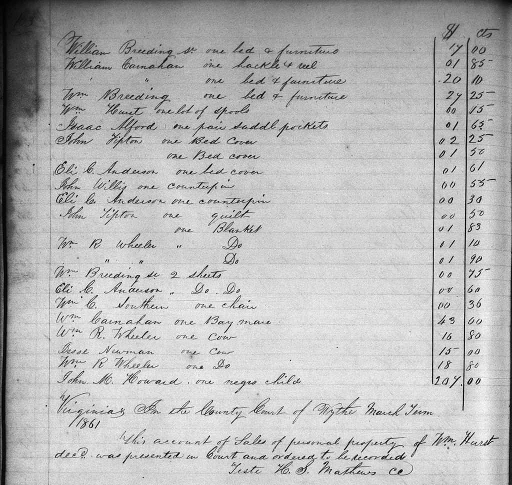 The first entry in the inventory is the enslaved man named Tom who is named in William Hurst’s will as a bequest to his daughter Elizabeth Carnahan. This entry is followed by an unnamed enslaved child ten months old. None of the other enslaved persons named in William Hurst’s will appear in the inventory and appraisal or the sale document. According to Gwen Hurst’s notes, a record states that Tom was sold at the Wythe County courthouse on 10 February 1862 to Samuel Stephens for $1,200. The citation I have for this record is incomplete, and I have not found the record.