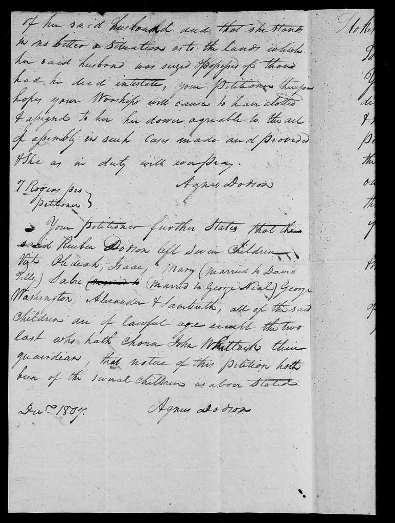 [4] Reuben Dodson’s date and place of death are stated in a petition Agnes made as his widow to Stokes County court in December 1807 regarding the disposition of two tracts of land Reuben died holding in Stokes County, one with 563 acres on Snow Creek and the other with 450 acres on Dan River. The petition is filed in Reuben’s loose-papers estate file held by North Carolina Archives. See also his nuncupative will, 10 September 1804, Stokes County, North Carolina, Will Bk. 2, pp. 58-9.