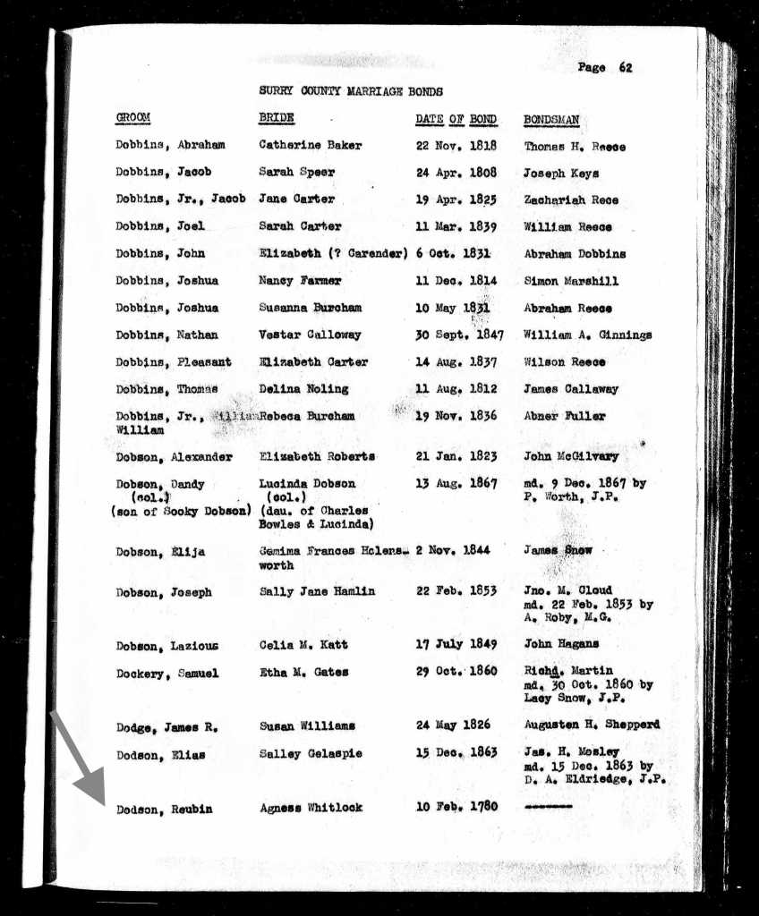 [3] The original bond, of which I do not have a copy, is on file with the North Carolina Archives, bond # 000144211. The Works Progress Administration abstracted and indexed original North Carolina bonds held by the state and created an index entitled North Carolina Marriage Bonds, 1741-1868. The original bond spells Reuben’s given name as Reubin and Agnes’s as Agness. This marriage bond is abstracted in the WPA abstracts for Surry County marriage bonds, p. 62, with a digital image of this page at FamilySearch.