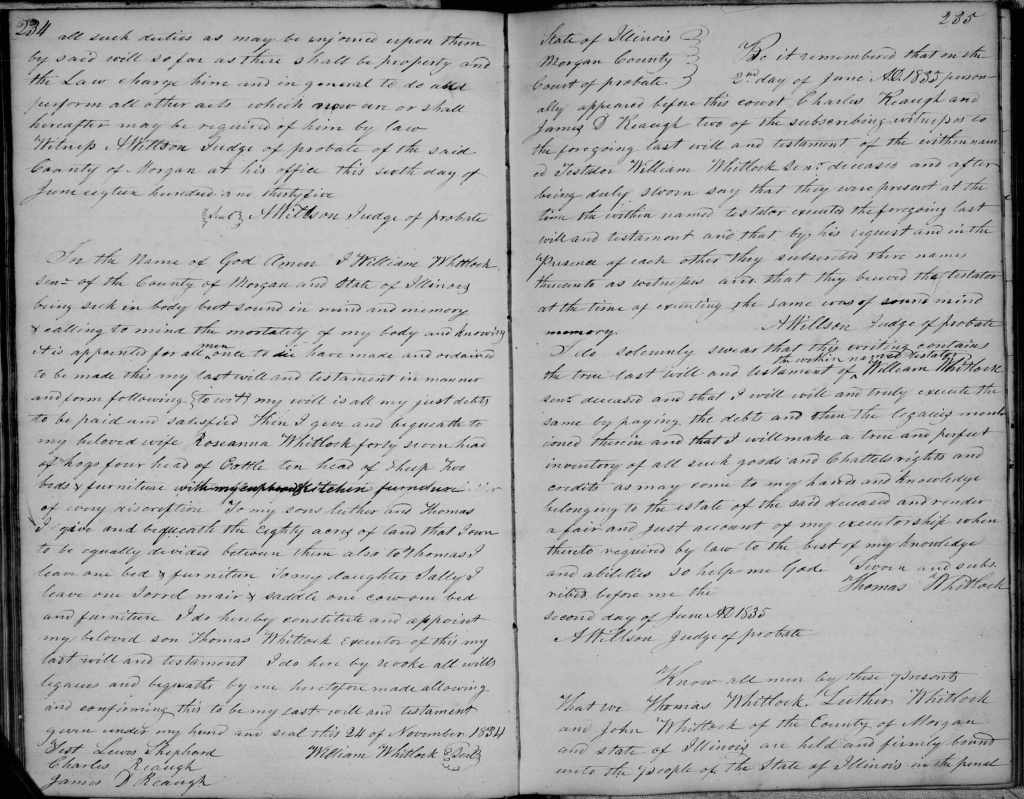 William Whitlock made his will in Morgan County on 24 November 1834, naming his wife Rosanna (spelled Roseanna in the will) and sons Luther and Thomas and daughter Sally.[28] The will makes Thomas executor. William signed the will with witnesses Lewis Shephard and Charles and James D. Reaugh. Charles and James proved the will on 2 June 1835 and on the same day, Thomas Whitlock gave bond with Luther and John Whitlock for execution of the will, with A. Wilson and Stephen A. Douglas as witnesses. Thomas was confirmed as executor on the same day. Stephen A. Douglas is Stephen Arnold Douglas, who serves as both a U.S. senator and representative from Illinois, and as a secretary of state for Illinois as well as a member of the state’s supreme court. He was one of two Democratic nominees for the presidency in 1860, when Abraham Lincoln was elected on the Republican ticket.