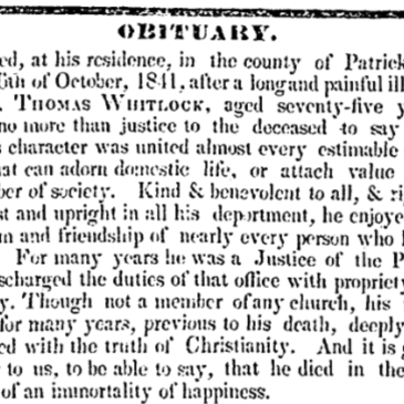 Or, Subtitled: “Mr. James Whitlock was Sworn a Vestry man for this parish and took the Oaths appointed by law, before Peter Garland Gent.” Researchers have conventionally estimated the birth of the James Whitlock (bef. 1690 – 1736) who was father of James Whitlock younger, who died between 7 March and 28 November 1749 in … More James Whitlock (bef. 1690 – 1736) of New Kent and Hanover County, Virginia, with Wife Frances