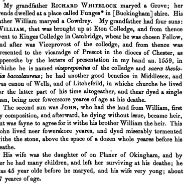 Or, Subtitled: “A pidle of land lieing at beare lane nowe in the teanure of the same John” John Whitlock, father of Richard Whitlock (abt. 1583 – 1642) of Wokingham, Berkshire, England, and London, was born around 1509. We can estimate his birth year as around 1509 on the basis of information provided by his … More John Whitlock (1509-1589), Owner of Manor of Beches, Wokingham, Berkshire, England