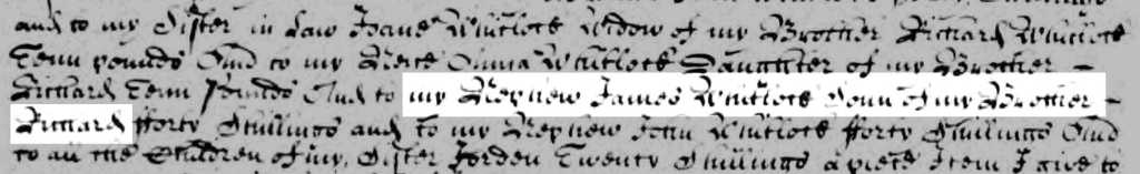 And there are more pieces of information that allow us to confirm the identity of James Whitlock (1651-1716), Virginia immigrant, and his connection to the Whitlocks of Beches manor in Wokingham, England. Two Whitlock wills from the Wokingham family name James Whitlock, son of Richard Whitlock. The 2 March 1670 will of Robert Whitlock (1618-1671) of Wokingham makes a bequest both to Joane Whitlock, James’s mother, who is named in Robert’s will as the widow of his brother Richard Whitlock, and to several of Richard and Joane’s children including James, who is identified as “my Nephew James Whitlock Sonn of my Brother Richard.”[11]