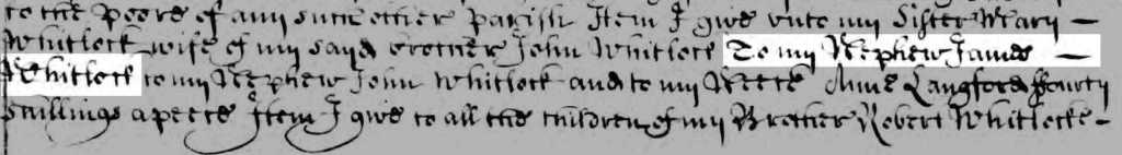 James Whitlock was also named as a nephew in the 14 June 1690 will of his aunt Katherine Whitlock Jorden (1622-1690), wife of Thomas Jorden (also Jordan) of London. Katherine was a sister of Robert (1618-1671) and Richard Whitlock (1616-1666), father of James[12]. Her will left a bequest to her nephew James, naming him as a nephew without stating the name of his father.